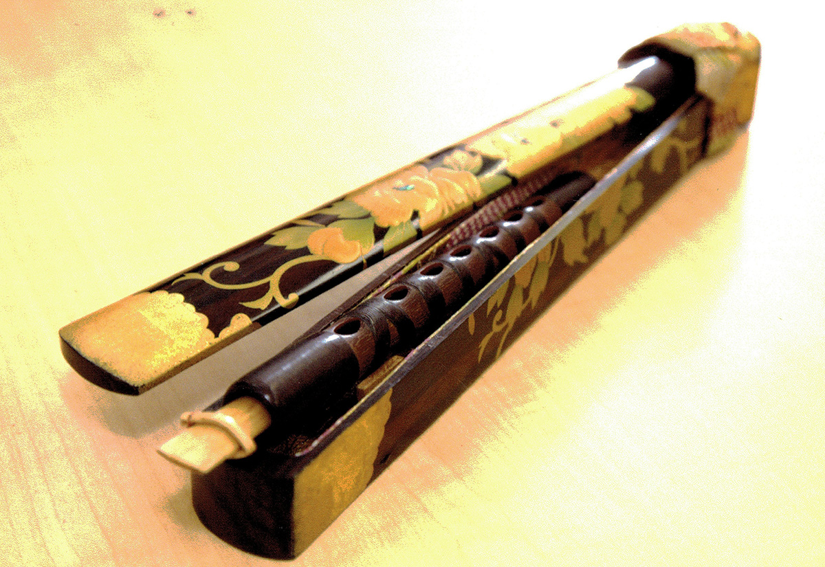 A small vertical bamboo pipe with a double reed, the hichiriki carries the principal melodic line. The reed is moistened not with water but with Japanese green tea, whose catechins provide antibacterial effects and stiffen the reed, allowing it to produce a firm, resonant tone.