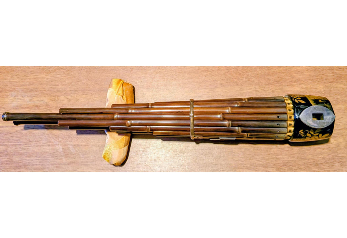 Composed of seventeen slender bamboo pipes bound together in a circle, the shō produces a pure, ethereal sound often called the “voice of heaven” and is reminiscent of a pipe organ. Its greatest enemy is moisture from the player’s breath. To preserve its clear tone, the instrument must be gently warmed over a brazier before and after playing to prevent it from drying out.