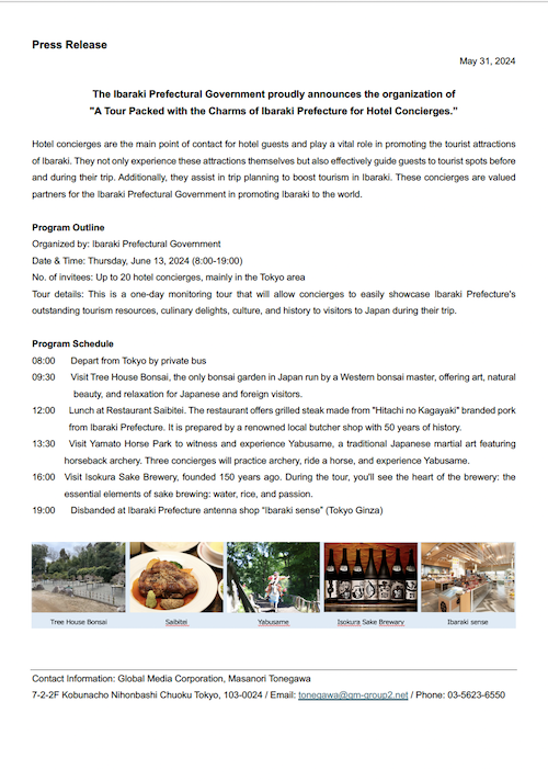 Press Release: The Ibaraki Prefectural Government proudly announces the organization of "A Tour Packed with the Charms of Ibaraki Prefecture for Hotel Concierges”