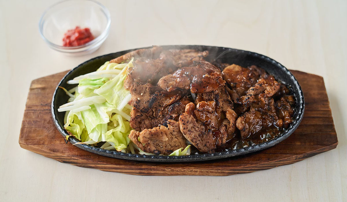 It’s “Gyu Gyu Grill”, that is a sizzling grill. At first glance it looks like yakiniku-style hotplate cooking, but it’s made with soy meat, and the texture is just the same as meat. That’s the most popular thing with customers from Japan and overseas.